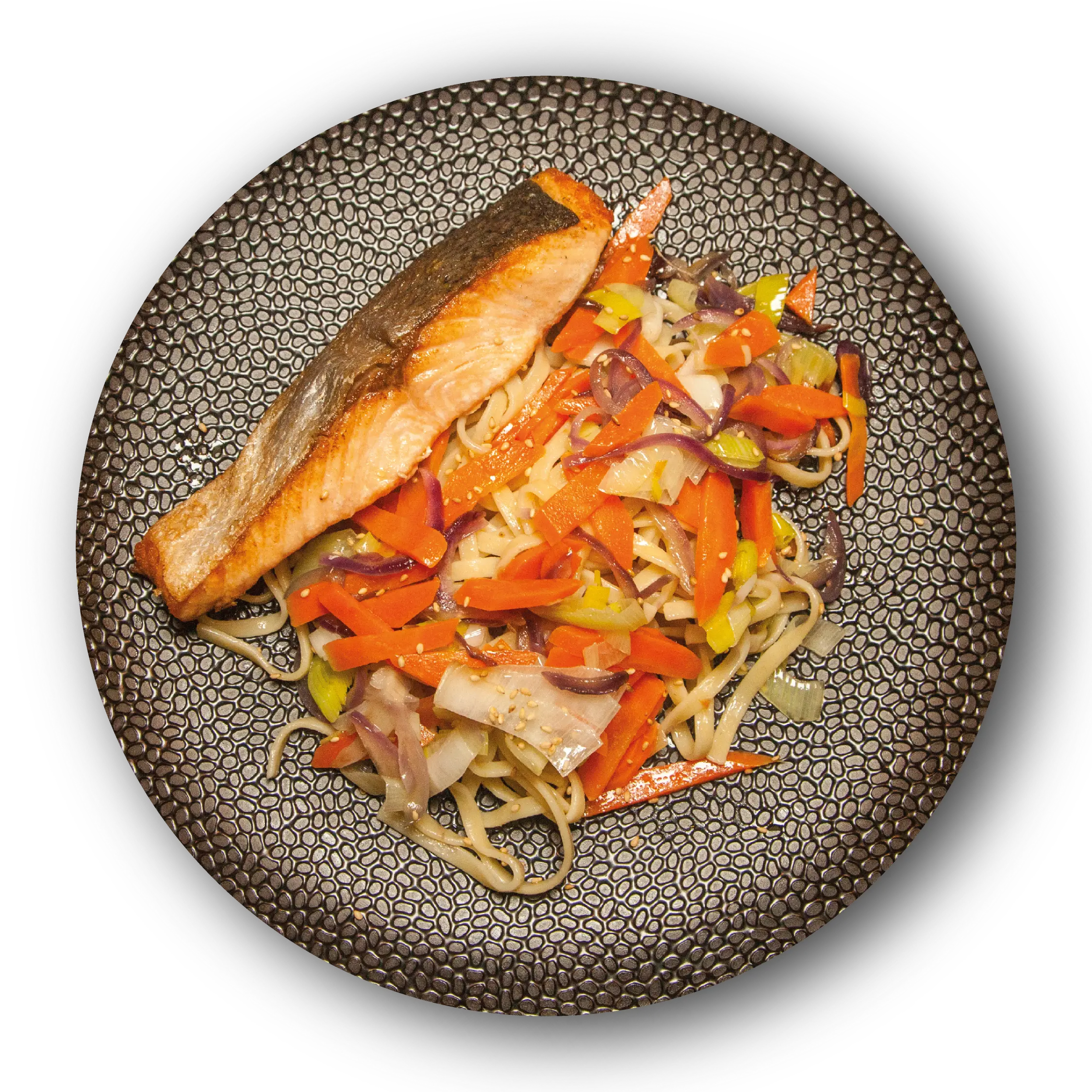 Dit gerecht bestaat uit langzaam gegaarde zalmfilet, waardoor de vis zacht, sappig en vol van smaak blijft. De zalm wordt geserveerd met eiernoedels die zorgen voor een lichte, vullende basis. De gewokte groenten van ui, prei, wortel en spitskool geven het gerecht een frisse bite en natuurlijke zoetheid. Een gebalanceerde en voedzame maaltijd met een lichte, Aziatisch geïnspireerde touch.